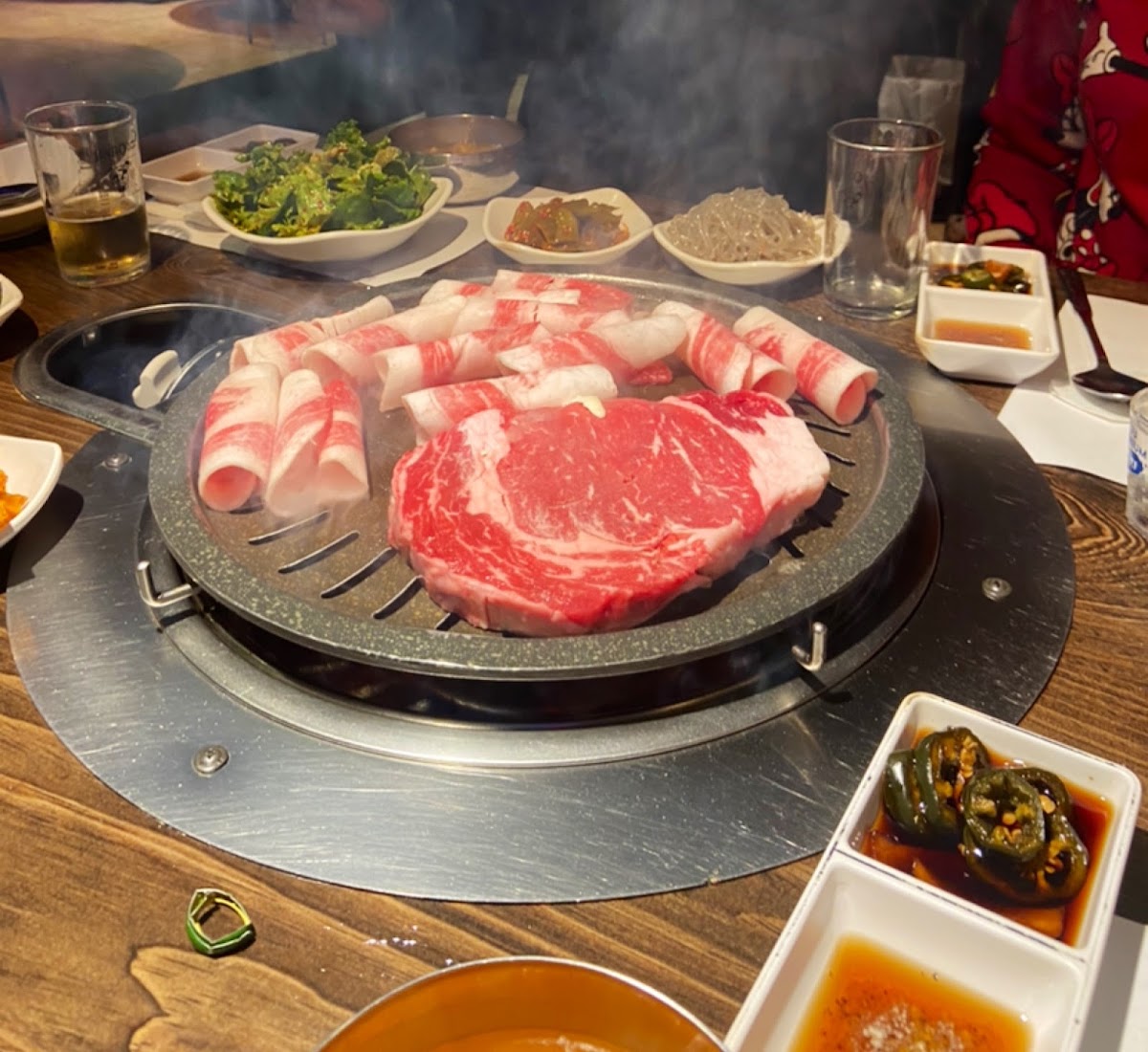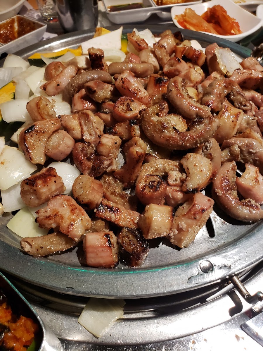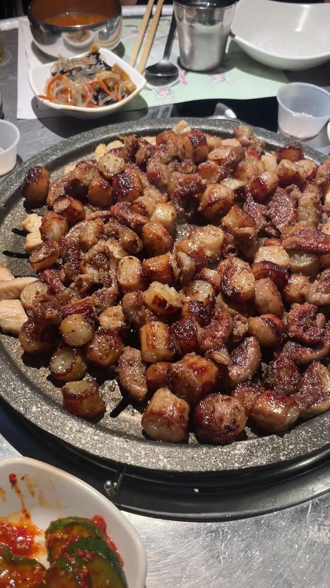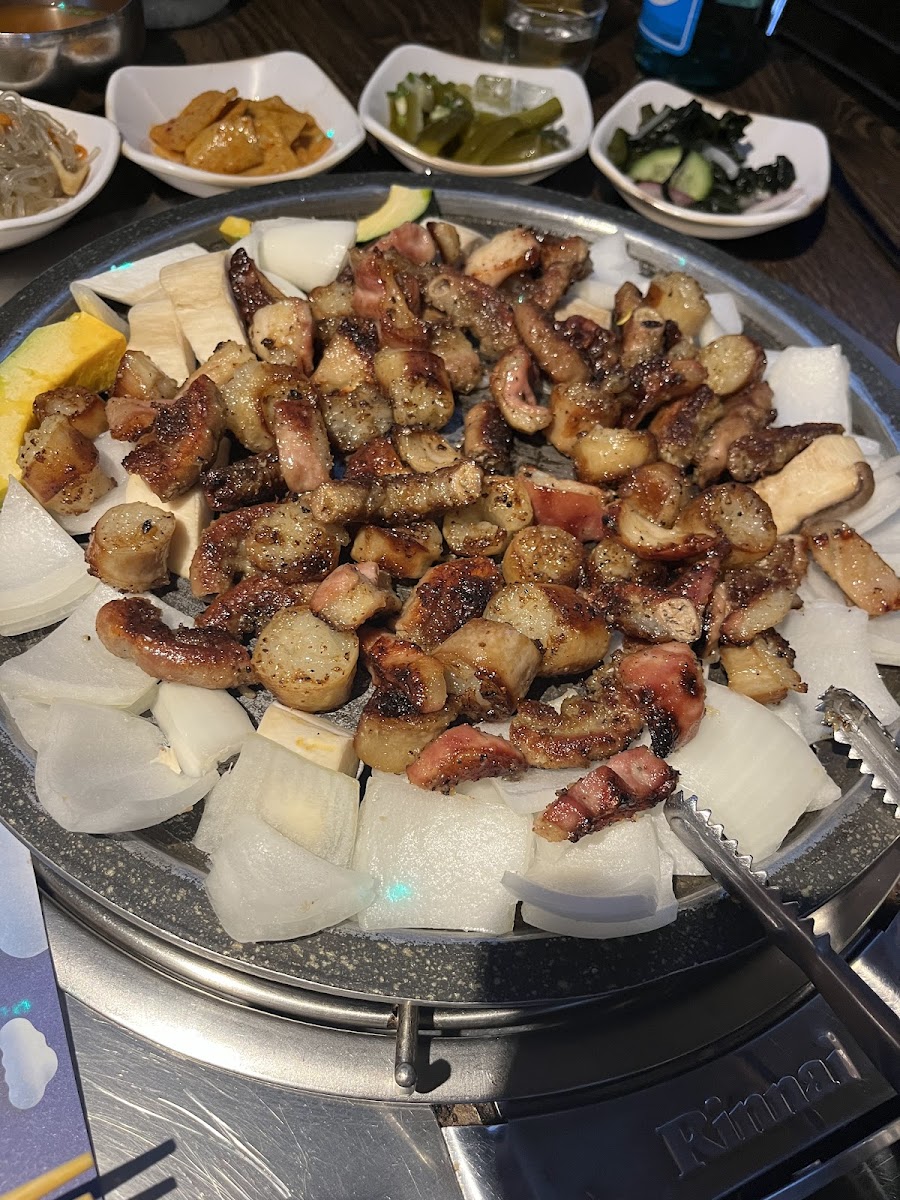 From experience, the real move is ordering a mixed platter and letting it cook until the edges caramelize. The staff usually recommends waiting, even when you’re tempted to dig in early. That patience pays off. When the server finally gives the green light, they cut everything into bite-sized pieces and toss in garlic, green onions, and sometimes kimchi to soak up the rendered fat. It’s communal, hands-on, and honestly pretty fun. One table next to us was celebrating a birthday, and the shared grill made it feel more like a house party than a restaurant.